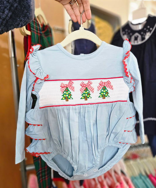 Smocked Girls Christmas Tree Ruffle Bubble